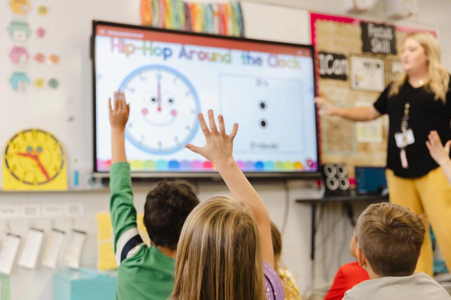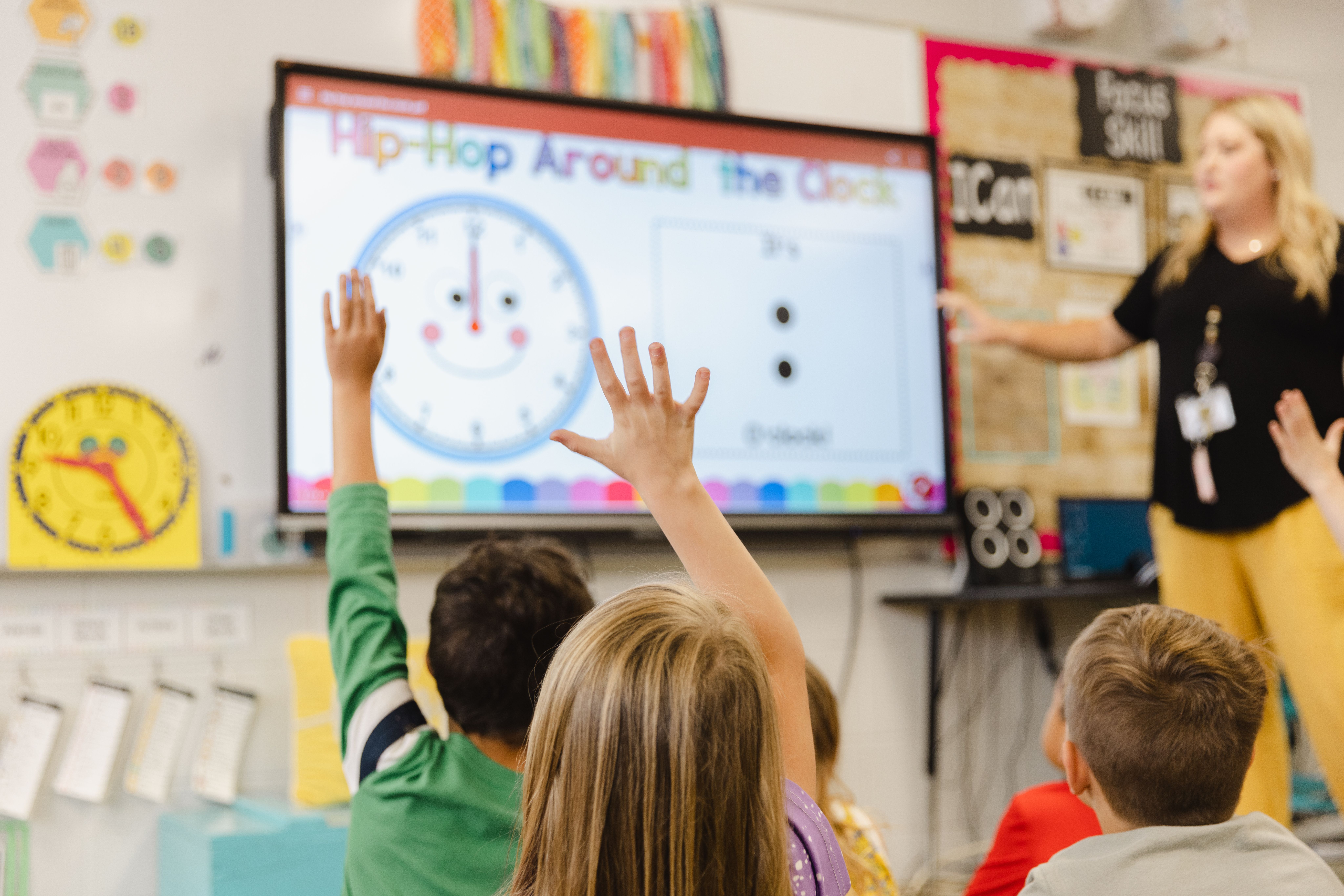Children's hands raise as a teacher in Blount County talks about telling time.